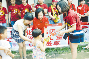 6月19日,端午節(jié)臨近之際,“美膚寶”攜手沈丘縣李玲化妝品店,來到沈丘縣豐產(chǎn)河小學(xué)開展“美膚寶陽光計劃”公益活動,共同為200多名留守兒童捐贈學(xué)習(xí)用品。圖為工作人員為留守兒童發(fā)放學(xué)習(xí)用品。(記者 韋偉 通訊員 王祥宇 柳珂)