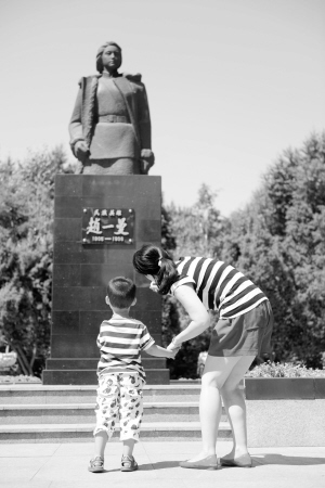 7月5日,在哈爾濱東北烈士紀(jì)念館旁的烈士廣場(chǎng),一名母親為孩子講述民族英雄趙一曼的英勇事跡。在“七七事變”紀(jì)念日即將到來(lái)之際,眾多游客來(lái)到哈爾濱東北烈士紀(jì)念館參觀,接受愛(ài)國(guó)主義教育。右圖為一名訪客在哈爾濱東北烈士紀(jì)念館內(nèi)參觀記錄。新華社記者 王凱 攝