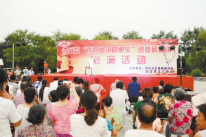 7月13日,沈丘縣“百姓宣講直通車”進(jìn)基層宣講首場(chǎng)演出在該縣中華槐園千字文廣場(chǎng)舉行,舞蹈、戲曲、小品、大鼓書等多樣化的藝術(shù)形式,為前來(lái)游玩休閑的市民獻(xiàn)上了一道豐厚的精神大餐,讓大家在娛樂之余,對(duì)黨的新理論新政策有了更多的了解。圖為節(jié)目演出現(xiàn)場(chǎng)。(邵永成 攝)